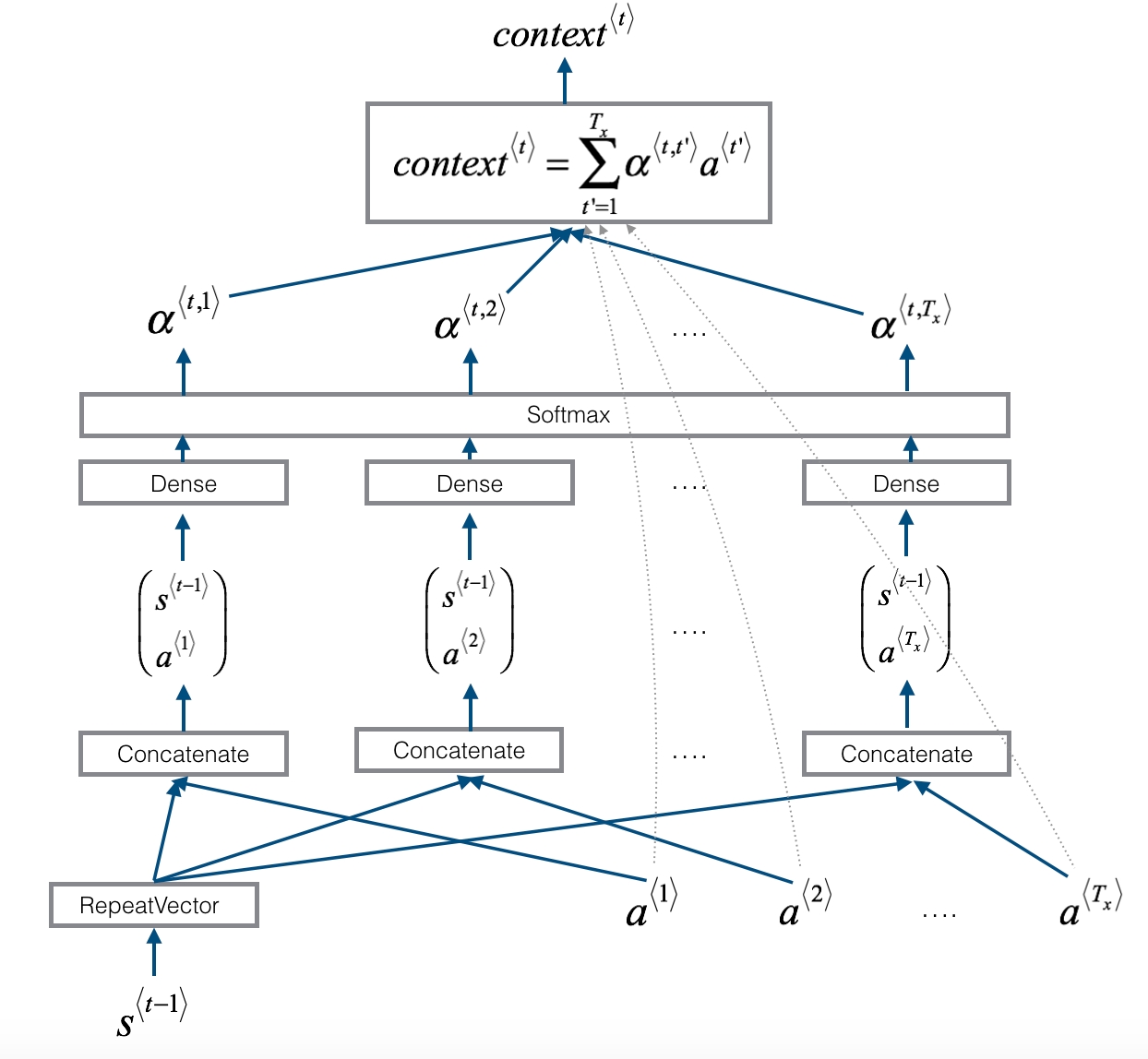 RepeatVectornode to copy s<t-1>'s value Tx times, and thenConcatenationto concatenate s<t-1>and a<t>to compute e<t, t>, which is then passed through a softmax to compute α<t, t>.