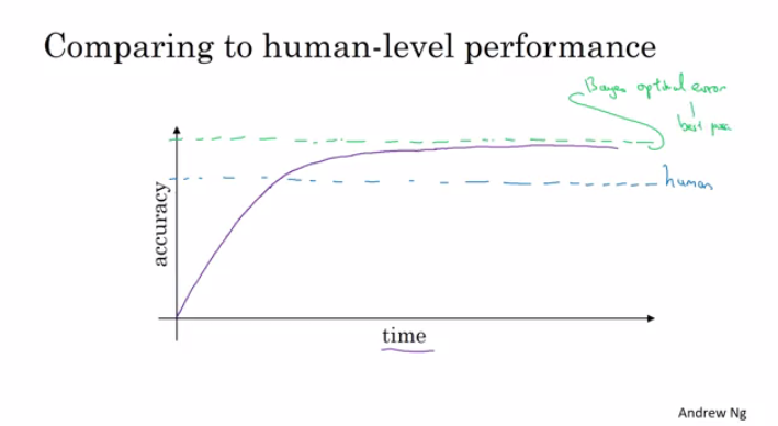 After an algorithm reaches the human level performance the progress and accuracy slow down.